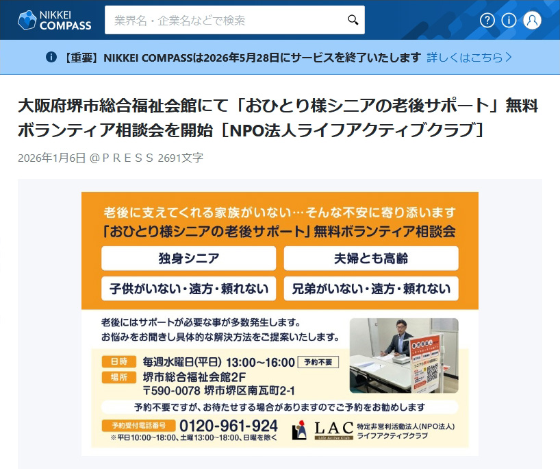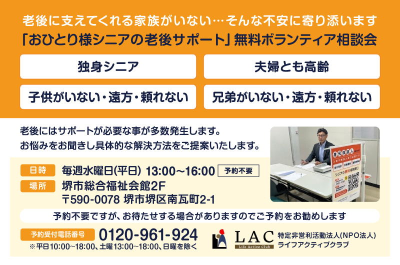 特定非営利活動法人(NPO法人)ライフアクティブクラブ(所在地:大阪府堺市、理事長:竹内信美)は、堺市総合福祉会館にて、「おひとり様シニア」を対象とした無料老後相談会(ボランティア)を開催することを決定しました。